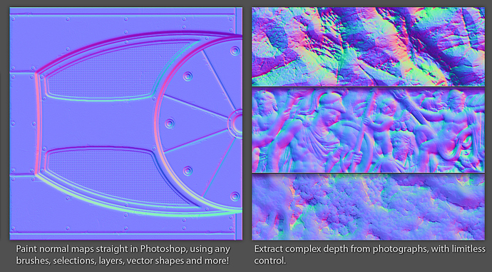 Introducing a toolset for quickly designing normal maps without ever leaving Photoshop, nDo is a melting pot of normal creation techniques. Sculpt using your custom brushes, create volumes from selections, paths or layers, apply filters, generate complexly multifaceted normal maps from height or photographs, rotate and transform without biasing normal – nDo is designed to cover many of your normal mapping needs in a to-the-point format.